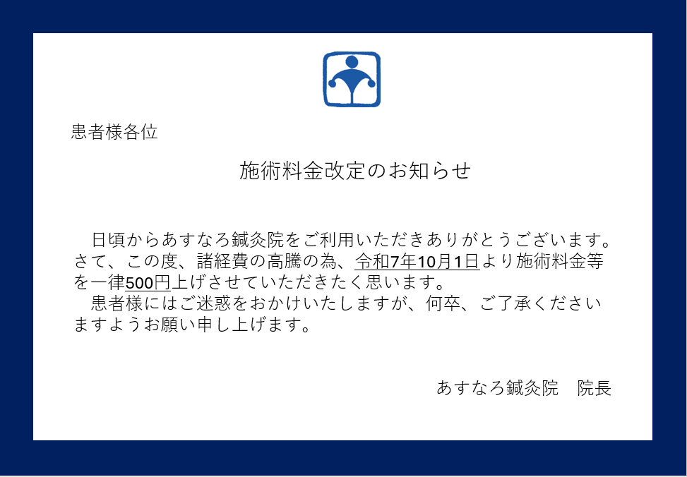 施術料金改定のお知らせ お知らせ 2025.08.15 昨今の諸経費の高騰の為、令和7年10月1日より施術料金を改定させて頂きます。患者様にはご迷惑をおかけいたしますが、何卒、ご了承くださいますようお願い申し上げます。